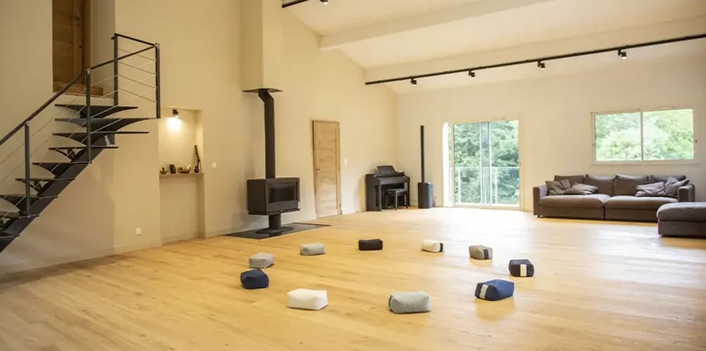 Une grande salle de pratique pour nos cours de yoga et discussions.