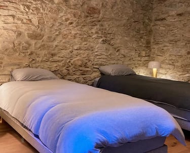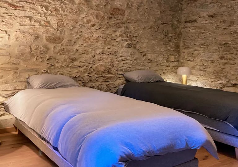 4 chambres doubles avec des lits simples et un dortoir avec 4 lits simples.